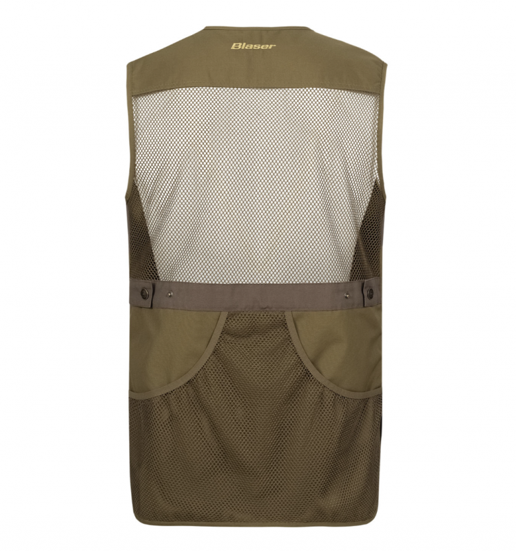 Dit stijlvolle Blaser Club Shooting Vest in de kleur Dark Olive voldoet aan alle verwachtingen. Het heeft twee ruime munitiezakken aan de voorzijde en een gamezak aan de achterzijde. Gaas op de bovenrug zorgt voor ventilatie en comfort tijdens de warmere maanden. De taille is verstelbaar met drukknopen.