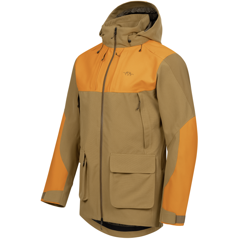 De Blaser Striker Jas Rubber Brown/Blaze Orange beschikt over een opbergsysteem voor alle jachtbehoeften.