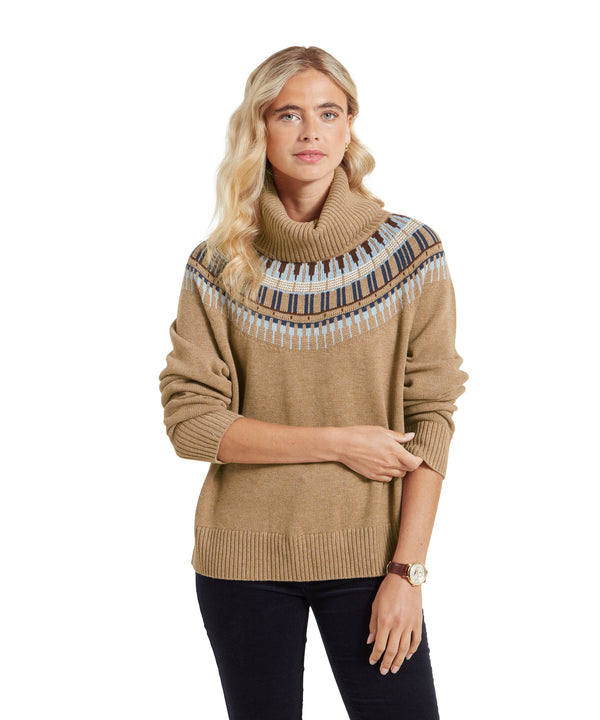 De Schöffel Filey Fairisle Roll Neck Jumper Warm Sand is een heerlijk zachte en warme wollen damestrui met een dikke rolkraag.
