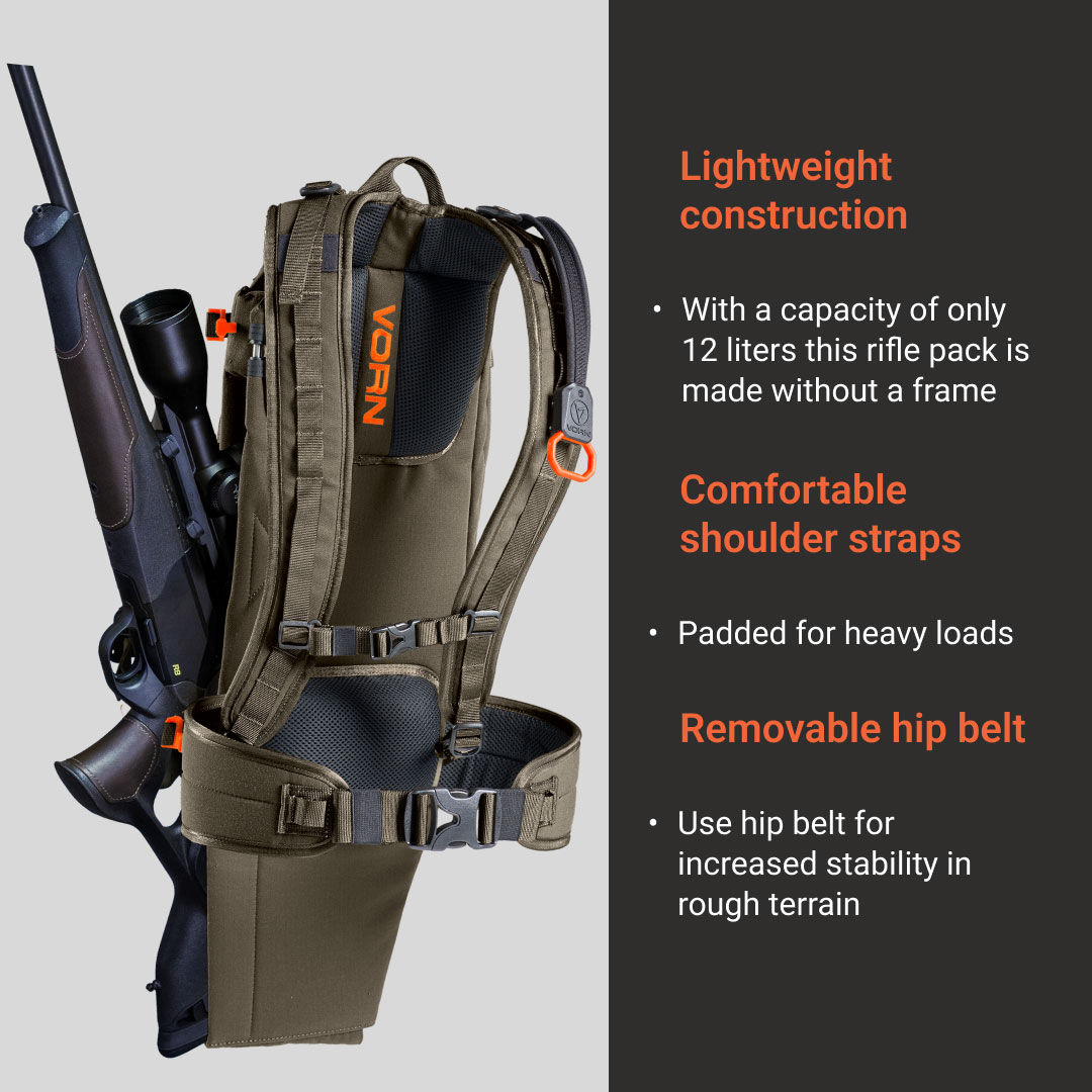 De Vorn LT12 Jachtrugzak Ash Green zijn favoriet bij jagers wereldwijd. Met het wapen goed beschermd in de rugzak, kun je je concentreren op de jacht. Het Quick Rifle Release systeem geeft je snel en betrouwbaar toegang tot het wapen wanneer je klaar bent om te schieten.